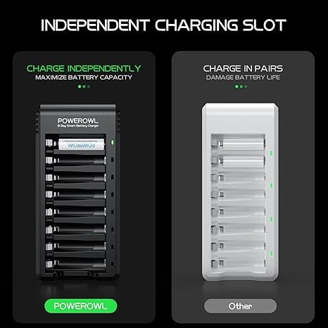 POWEROWL smart charger passed US safety certification comes with chip control, when the battery is fully charged, it will automatically stop charging, and with LED indicator. (NOTE) only compatible with NiMH or NiCD AA and AAA rechargeable batteries.