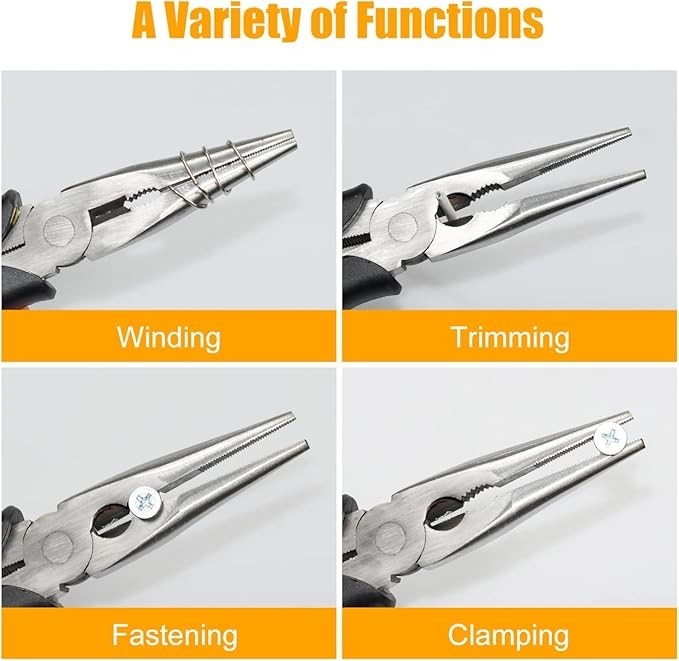 【Labor-saving Design】The needle-nose pliers are designed on the principle of lever. The length of the pliers wall is larger than the pliers head, so it saves more energy when using. Lengthen clamp head design, easy to use in narrow space; It has the functions of fastening, clamping, winding, cutting and stripping