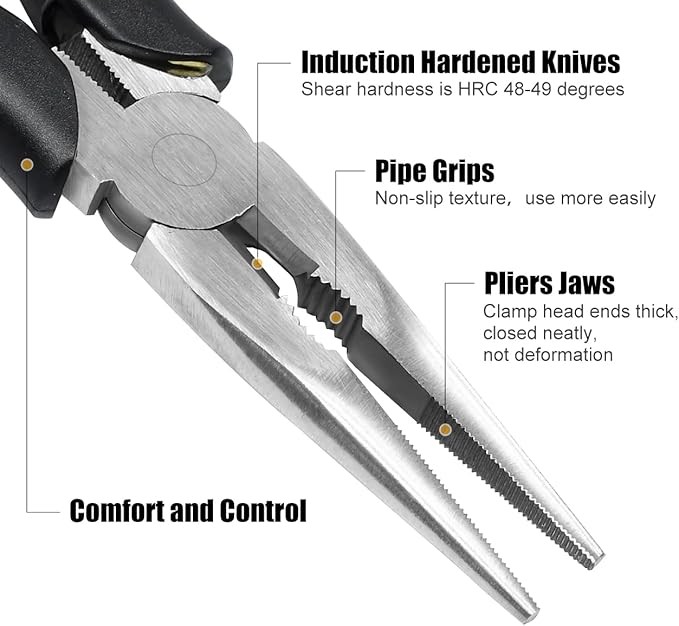 【High Quality Material】 The nose pliers body is made of high quality carbon steel, and the handle is made of TPR material in accordance with environmental protection standards; 6 inch needle-nose pliers force saving spring design, easy to use effortless; The nose pliers are well made, the jaws are neat, the handle is comfortable and non-slip; The blade is sharp and durable, with stronger shear force and longer service life