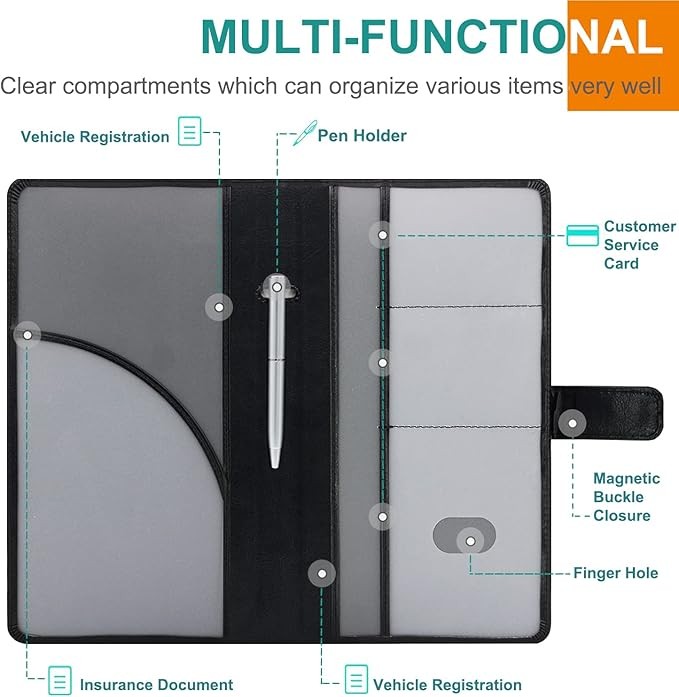 WELL ORGANIZED: The car document holder has been custom made to perfectly keep all of your important documents together. It has multi-function clear compartments which can organize various items very well. Clear and easy to read both documents when you open it up. 1 large pocket for insurance documents and 2 pockets for vehicle registration, 3 small pockets for driver's license, ID cards, AAA cards, business cards, receipt, key contact information cards, etc.