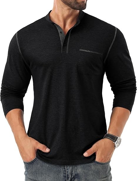 Classic Henley Tee:Color contrast long sleeve henley with a 3 button placket and chest pocket. Made with sturdy stitching for a clean, casual look. A timeless wardrobe essential.
