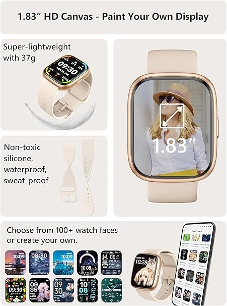 【2 Straps, Zero Weight, All-Day Style】Two quick-release straps for instant style changes. This ladies smart watch features a 1.83" HD display weighing just 38g—so light that teens, women, and men forget it’s there. Enjoy razor-sharp colors with 360*440 resolution. Choose from 100+ watch faces to match your daily style.