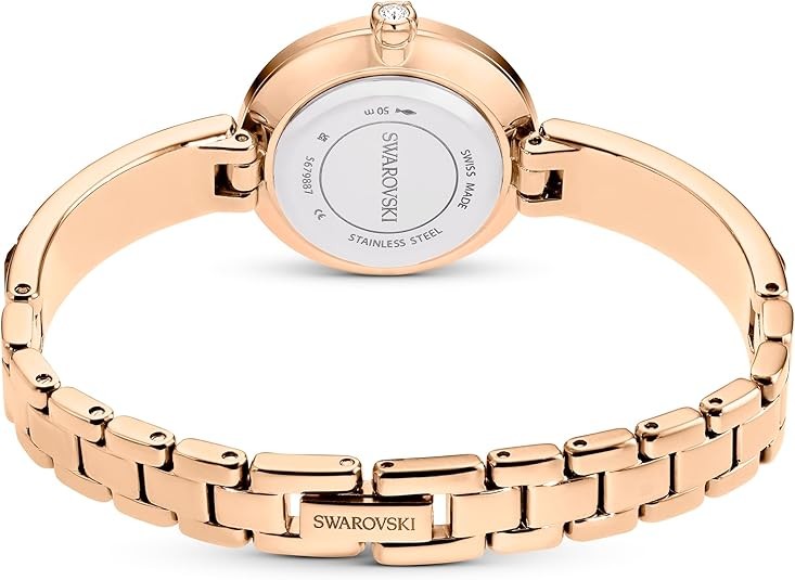 The 25mm stainless steel design has a rose gold-tone finish and is encircled by a bezel with 20 baguette-cut dark gray crystals, while a single crystal is set within the crown