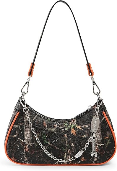 Iconic Von Dutch Bag: A small shoulder handbag for the ages. Classic Von Dutch logo emblazons the front of the tree camo purse. Bright orange trim and large orange logo draw the eye and complement the camouflage background