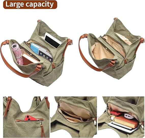 DURABLE MATERIALS AND LARGE DIMENSION:high density 100 % 16 oz washable cotton canvas hobo Tote purse; breathable polycotton lining; high quality PU leather; durable magnetic button and smooth zipper. Approx. 11.8 x 13.3 x 4.7 inches. Straps: Height: 10.5 inches; Around 1.47 pounds