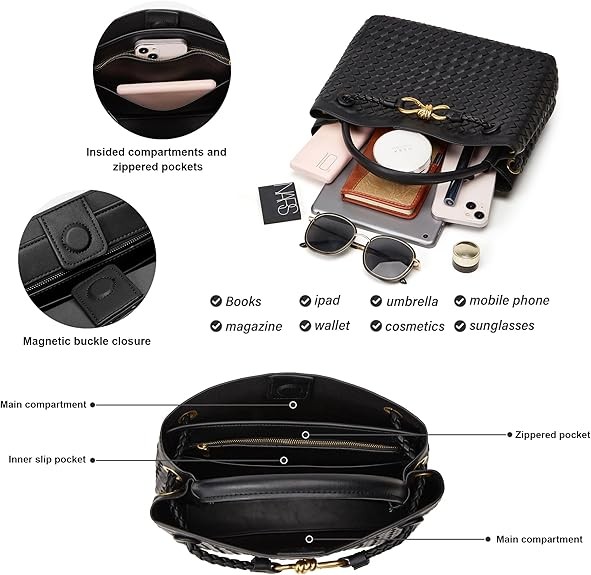 Woven Bags for Women: This small woven tote bag is made of vegan leather. It is very soft , comfortable to touch and easy to wipe clean. The adjustable strap is very easy to rest it on your shoulder. Womens must have woven handbag with bowknot for your daily leisure, relaxing vacations.